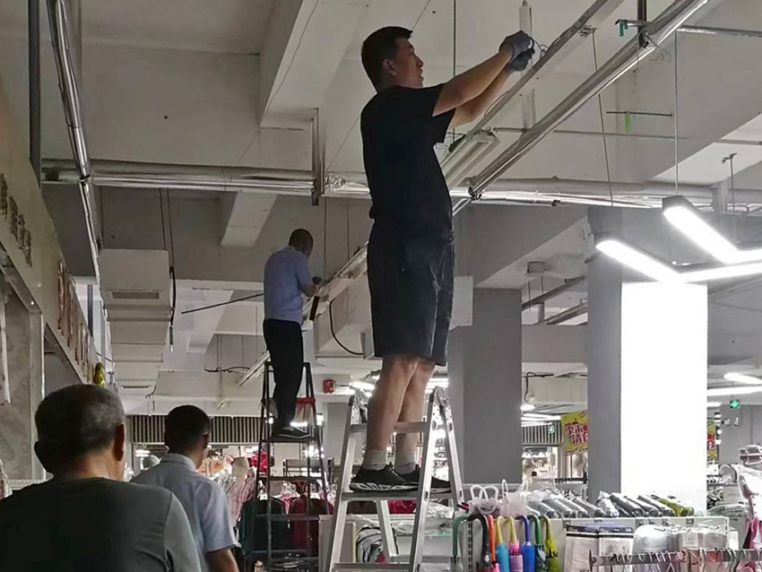 高新店街市改造,王金文和劉軍偉自己動手為燈光較暗的區域安裝燈管。