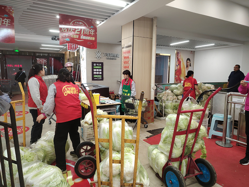 二十一周年慶期間,民生店同事們齊心協力,加班加點提前將店慶福利贈品大白菜擺放在兌獎處,以便顧客兌換領取。